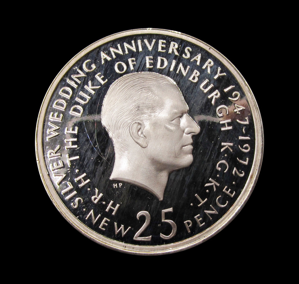 A trial piece produced by Paget for a 25 New Pence piece celebrating the Silver (25th) Wedding anniversary of Queen Elizabeth II and Prince Philip, Duke of Edinburgh. The bust would not be used officially until 2017.