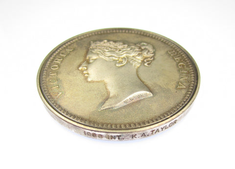 Hallmarked below rose on reverse.The obverse features the same young head portrait of Victoria that was used on the 1837 Guildhall medal and, more widely, on the Penny Black stamp. Edge engraved '1988 INT. K.A Taylor'.