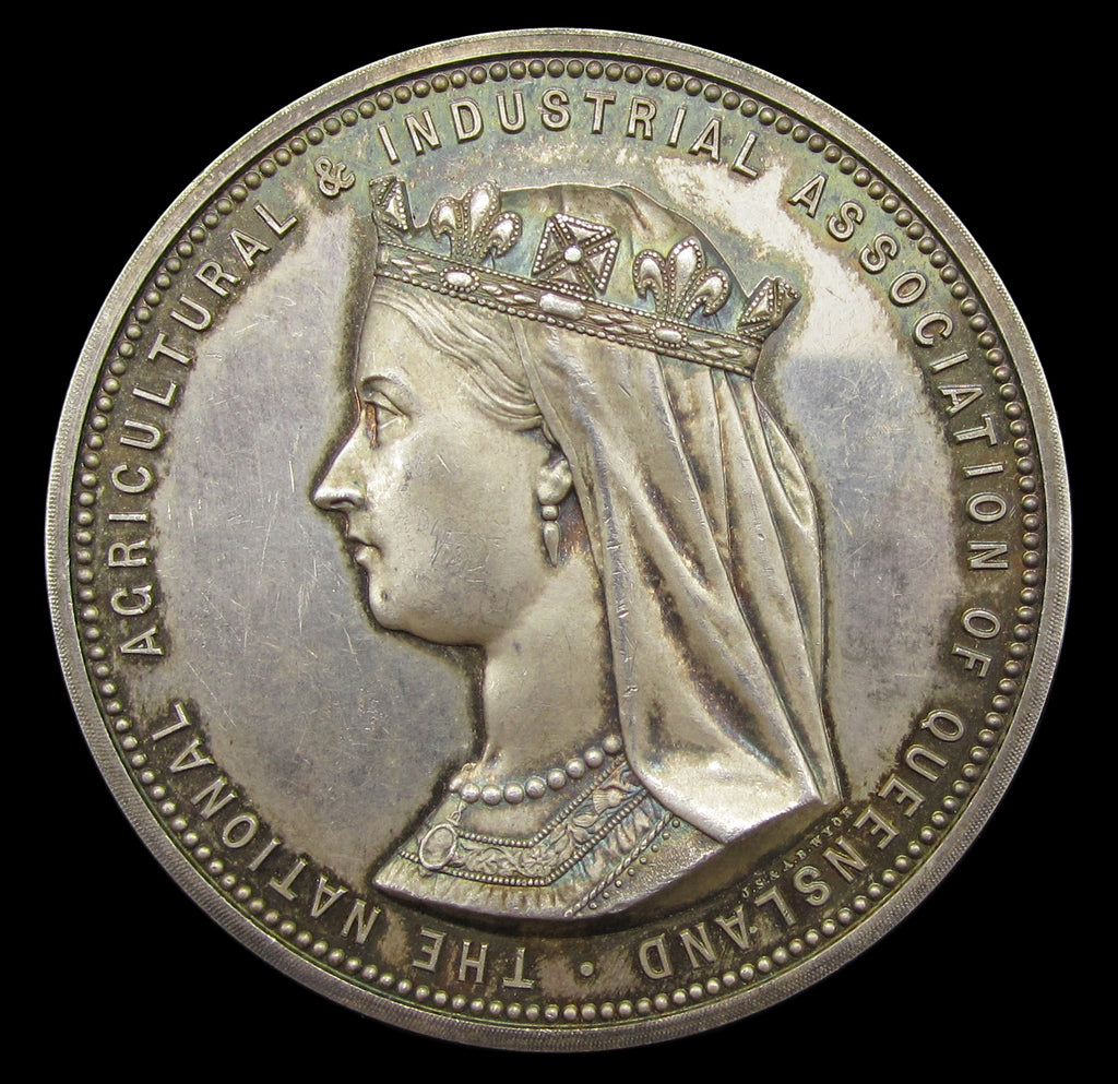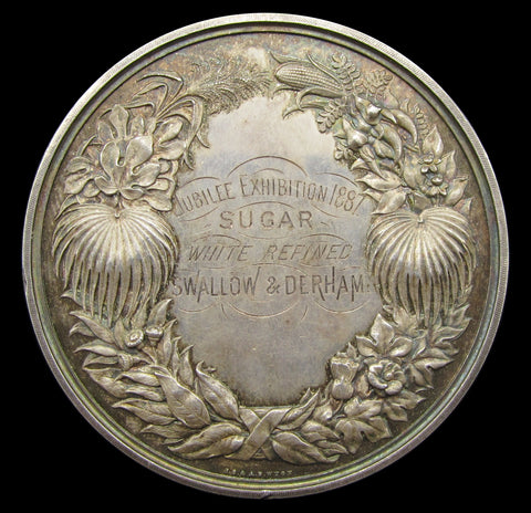 The National Agricultural & Industrial Association of Queensland, (1887), prize medal, in silver. Reverse engraved with 'Jubilee Exhibition 1887 - Sugar - White Refined - Swallow & Derham'.