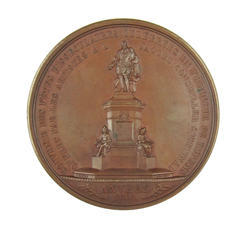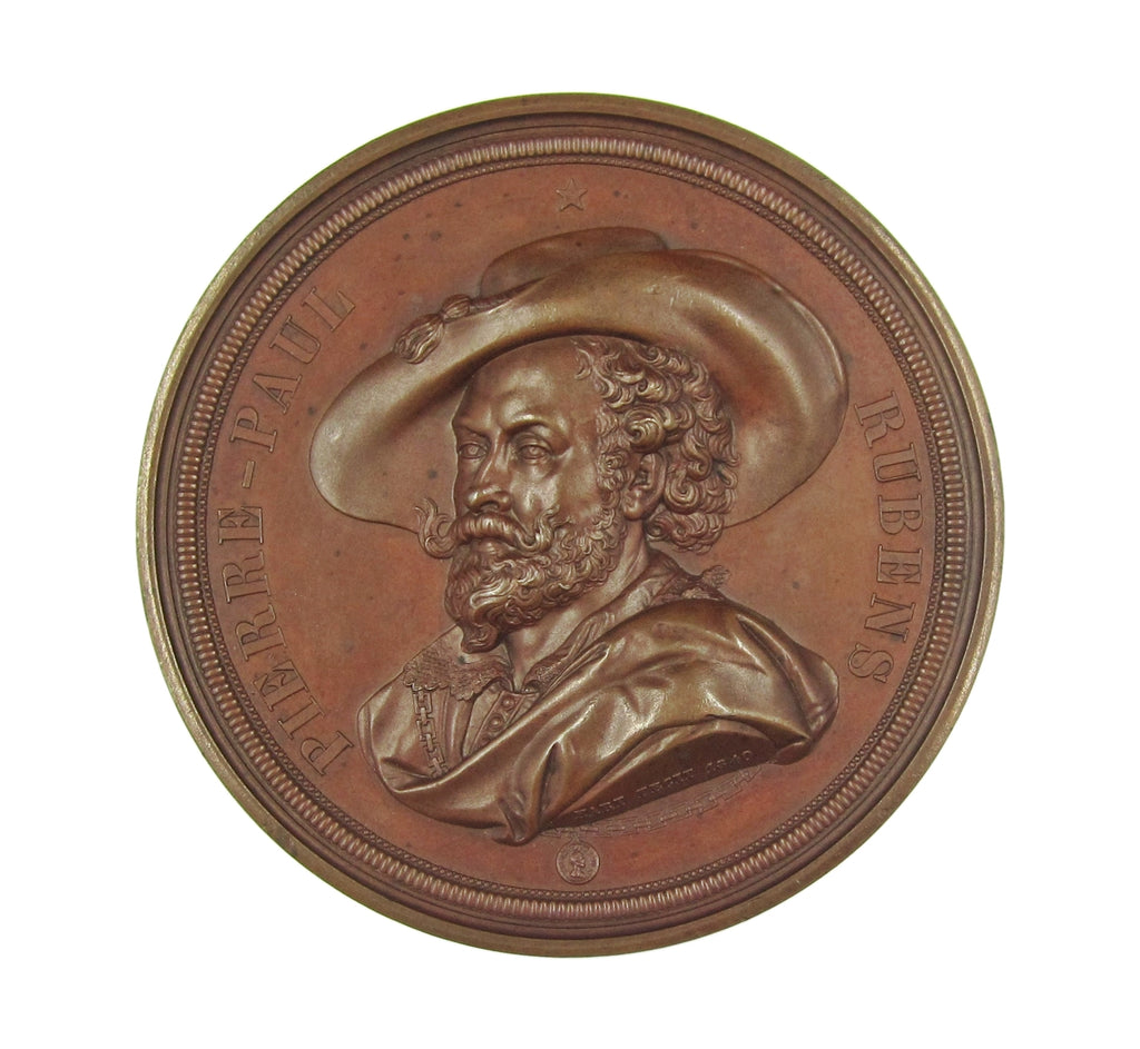 Obverse with Rubens wearing hat and chain with a coin pendant, reverse showing the Antwerp statue of Rubens.