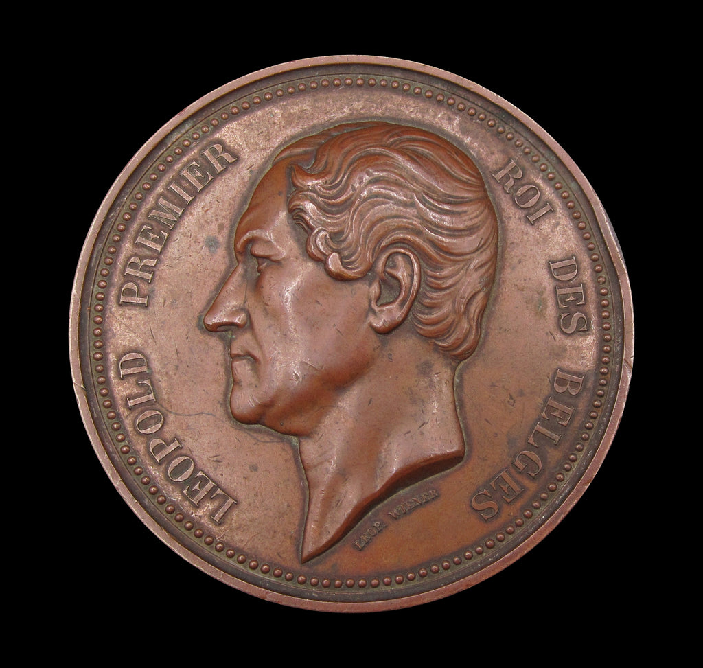Obverse with bare head bust, reverse with Belgium standing right, holding scepter and placing wreath on crown set upon throne.