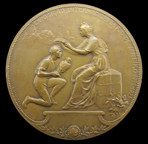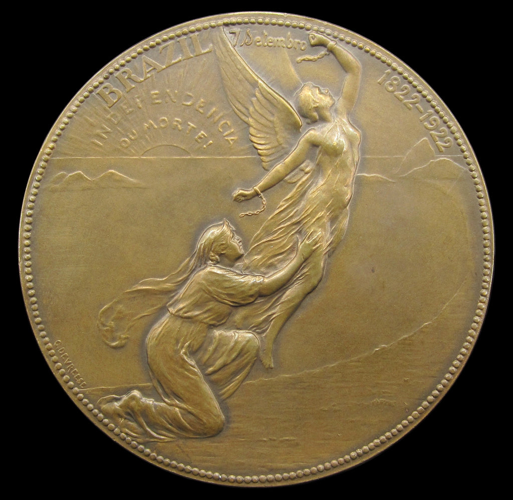 For the Centenary of Independence and the International Exposition in Rio de Janeiro. Reverse with veiled kneeling woman on shoreline reaching upward for Victory rising with broken chains, obverse with female figure sitting on bale laureating male figure holding large vase with exposition grounds in upper background. Edge stamped J.Fonson.