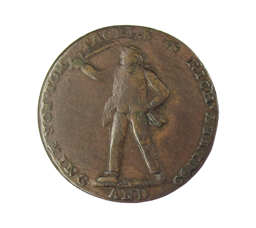Obverse with a sailor brandishing a cutlass surrounded by 'TOM TACKLE IS RICH FOR KING AND COUNTRY', reverse with a sailor with a peg leg and crutches surrounded by 'TOM TACKLE IS POOR MY COUNTRY SERV'D'.