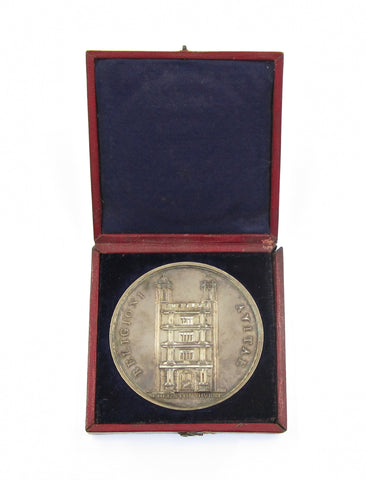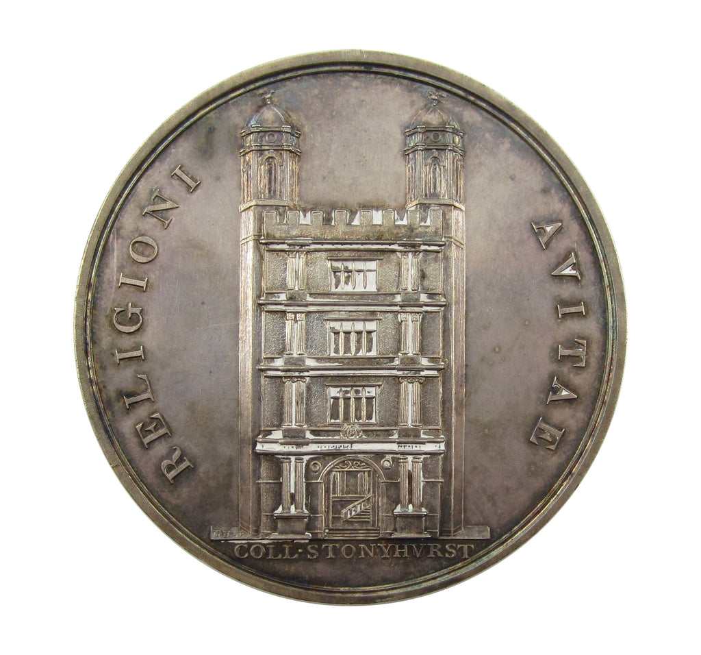 Clitheroe, Lancashire, Stonyhurst College, silver prize medal, c.1832. Obverse showing the tower entrance, reverse with legend within ivy wreath,
