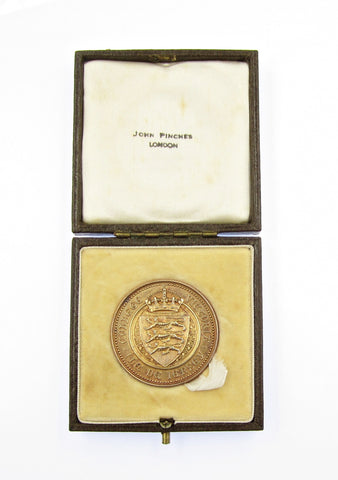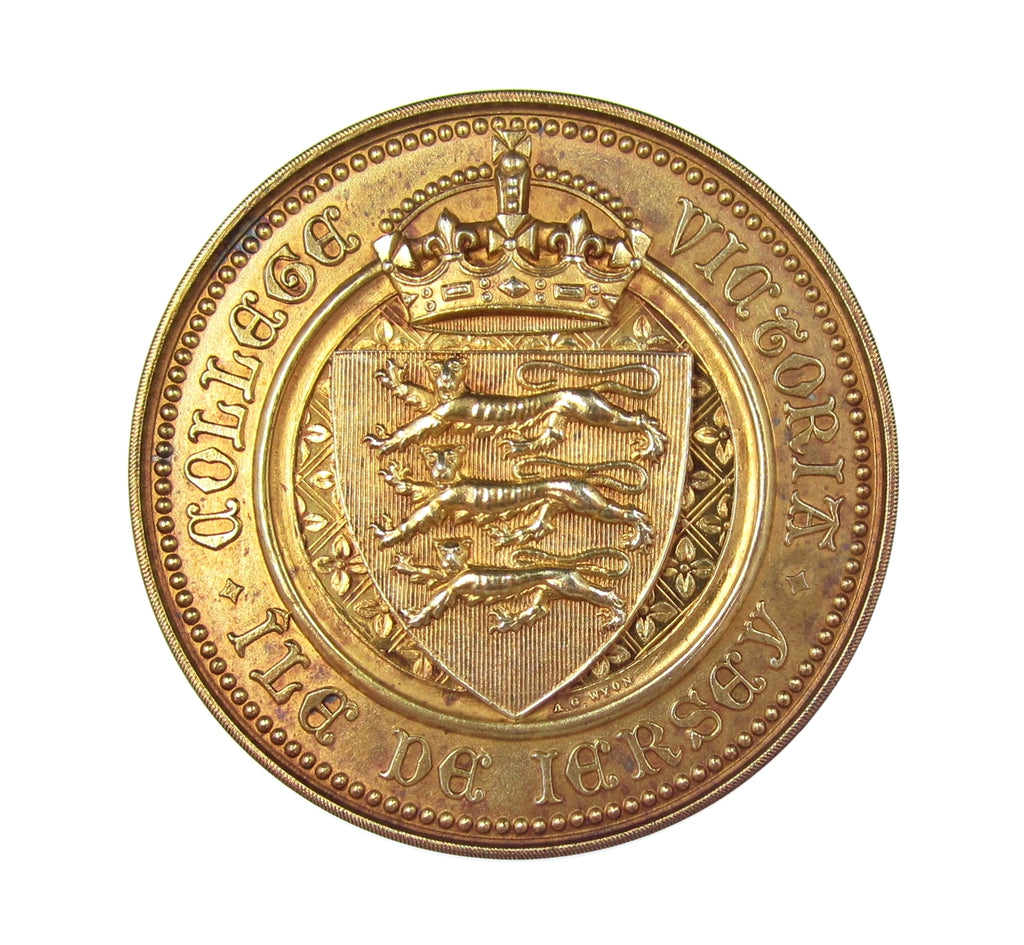 Victoria College, Jersey. Obverse with crowned arms of Jersey, reverse with 'Prix de Francais' on ribbin, on decorative background. Edge named to P.J Bisson.
