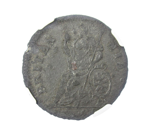 Tin issue. Cuirassed bust, Britannia seated to reverse.