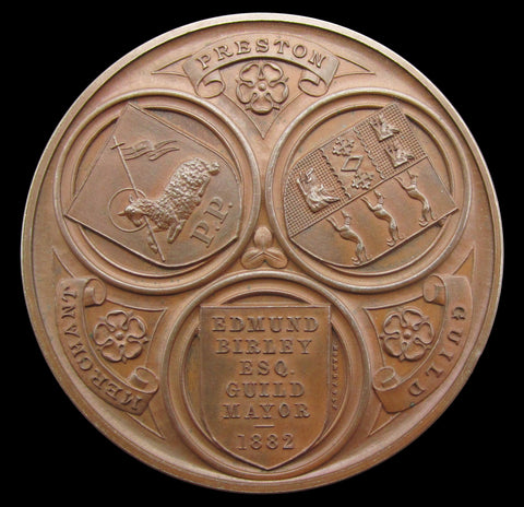 Obverse with conjoined busts of the Duke & Duchess of Albany. Reverse showing the arms of the Preston Merchant Guild.
