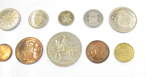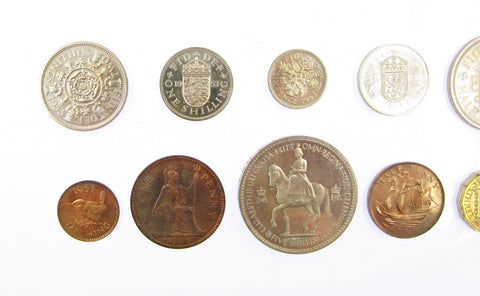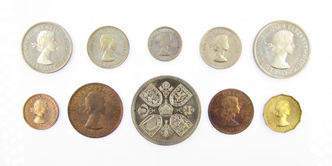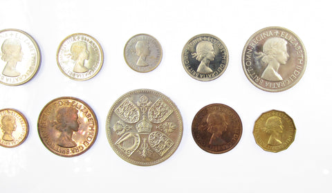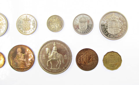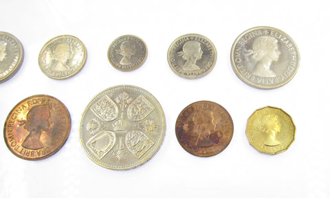 Complete proof set including Crown, Halfcrown, Florin, Shillings with both the English and Scottish reverses, Sixpence, Brass Threepence, Penny, Halfpenny and Farthing.