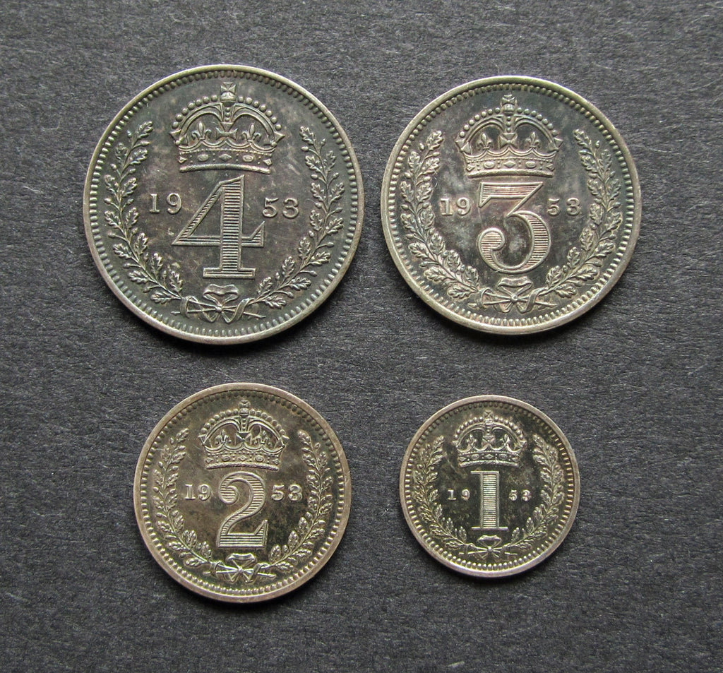 The Twopence has a small obverse scratch otherwise the coins are about Uncirculated with attractive, matching, prooflike toning. Housed in red Royal Mint Maundy Case. Scarce.