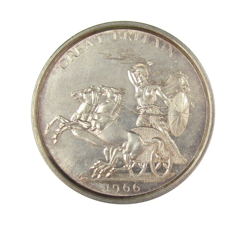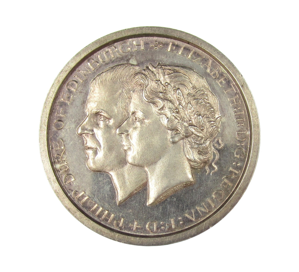 Pattern crown by Anthony Foley & K.C Hunt struck in .925 silver. Obverse with conjoined busts of Elizabeth II & Prince Philip, reverse with Britannia riding in a biga, hurling thunderbolts.
