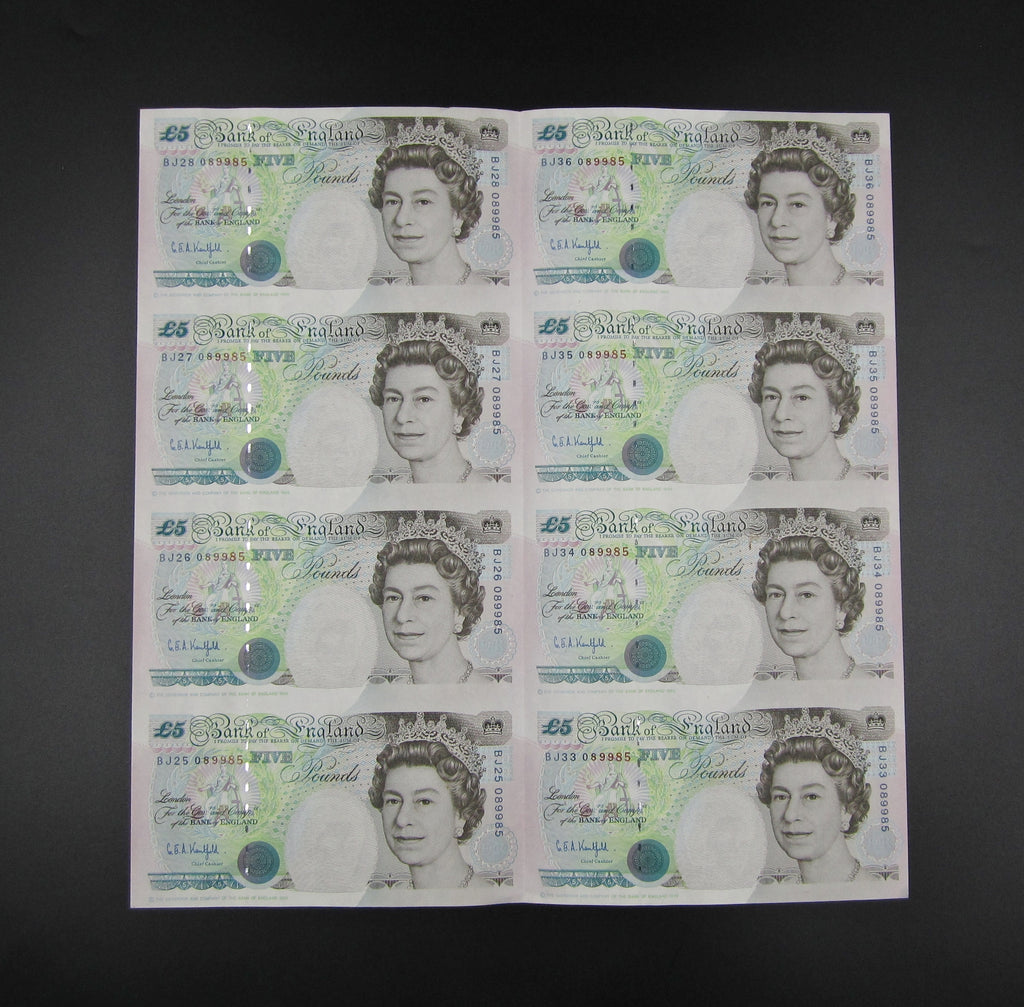 Elizabeth II Uncut Sheet Of 8 x Kentfield £5 Banknotes