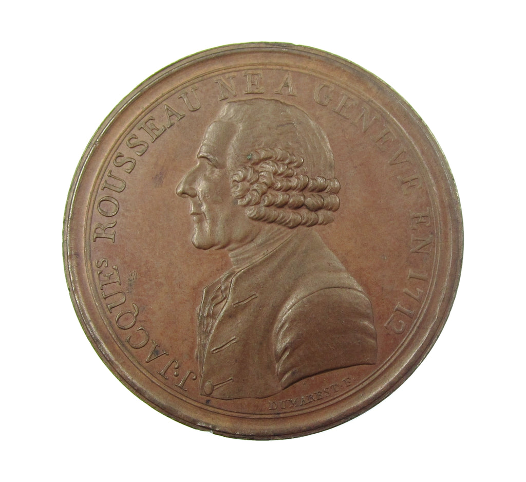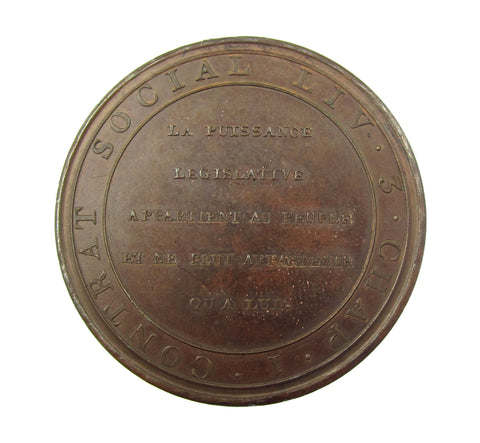 Obverse with bust of Jean-Jacques Rousseau (1712-1778), reverse with 5 line inscription within legend. Incuse lettered edge.