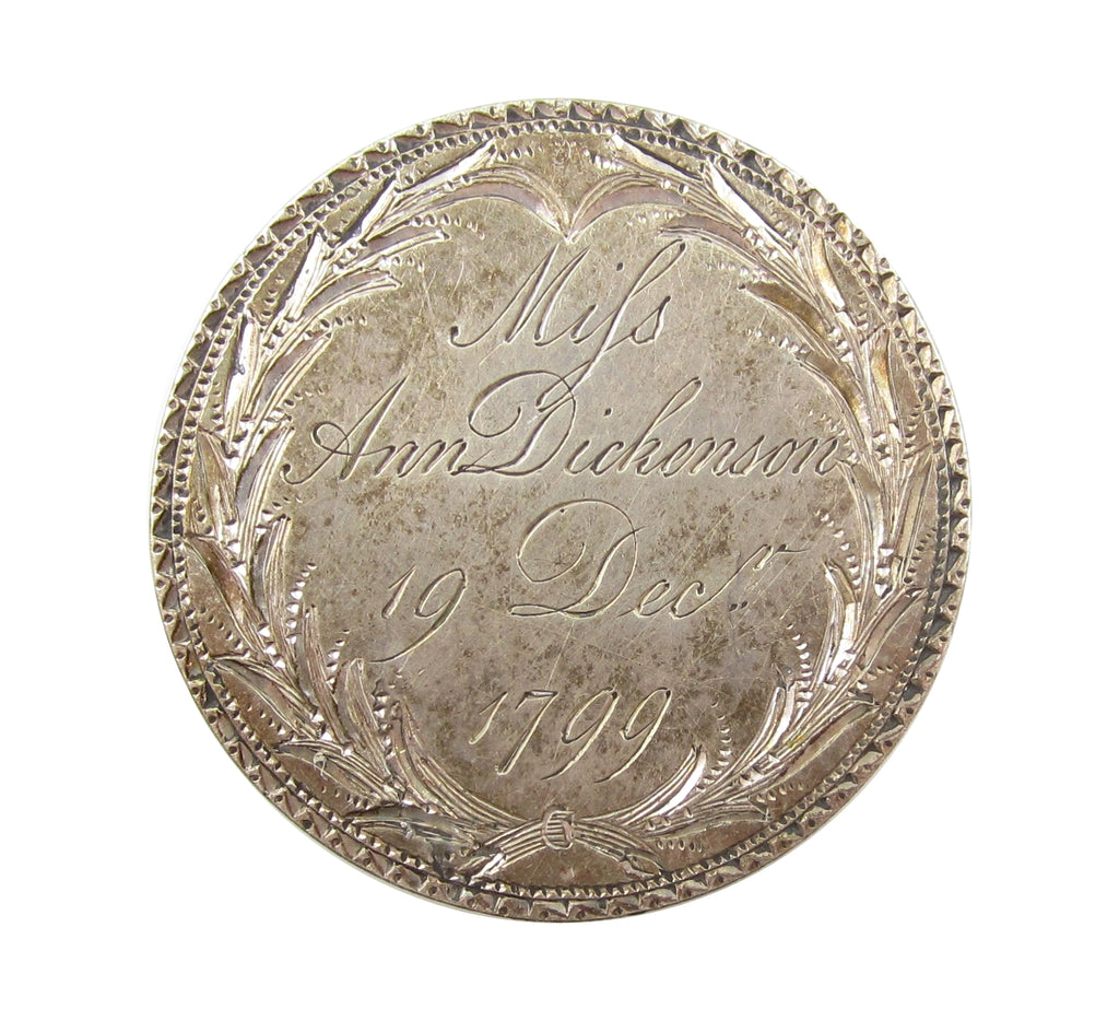 Engraved 'Le merite doit etre encourage' (merit must be encouraged), named to 'Mifs Ann Dickenson - 19 Decr 1799'.