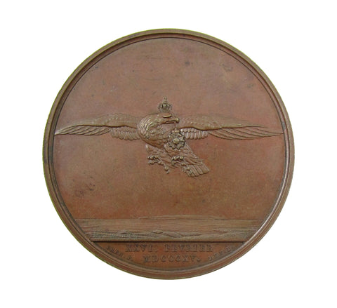 Obverse with eagle flying left, clutching medal in beak. Obverse with Napoleon standing with arms crossed, French peasant standing, arms raised in supplication, and soldier holding rifle. Edge plain.