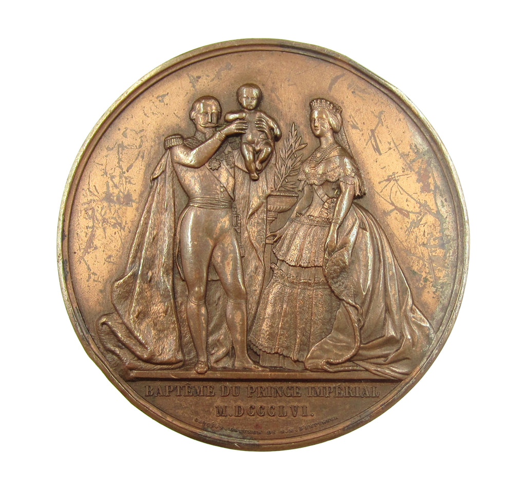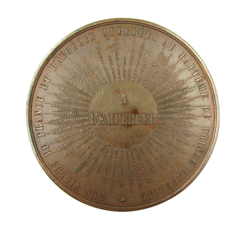 Obverse showing imperial family portrait, Napoleon III holds his child high above him. Reverse with a list of cities making a sun around the inscription A L'EMPEREUR, within inscription.