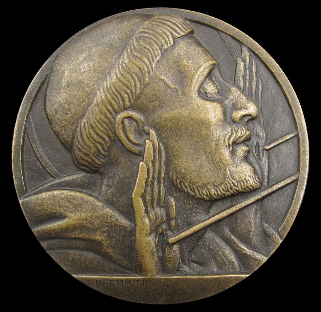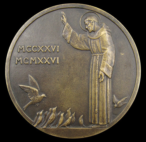 Struck to commemorate the 700th anniversary of his death. Obverse with head of St Francis of Assisi, his hands pierced by arrows, reverse showing the Saint preaching to birds. Edge numbered 158.