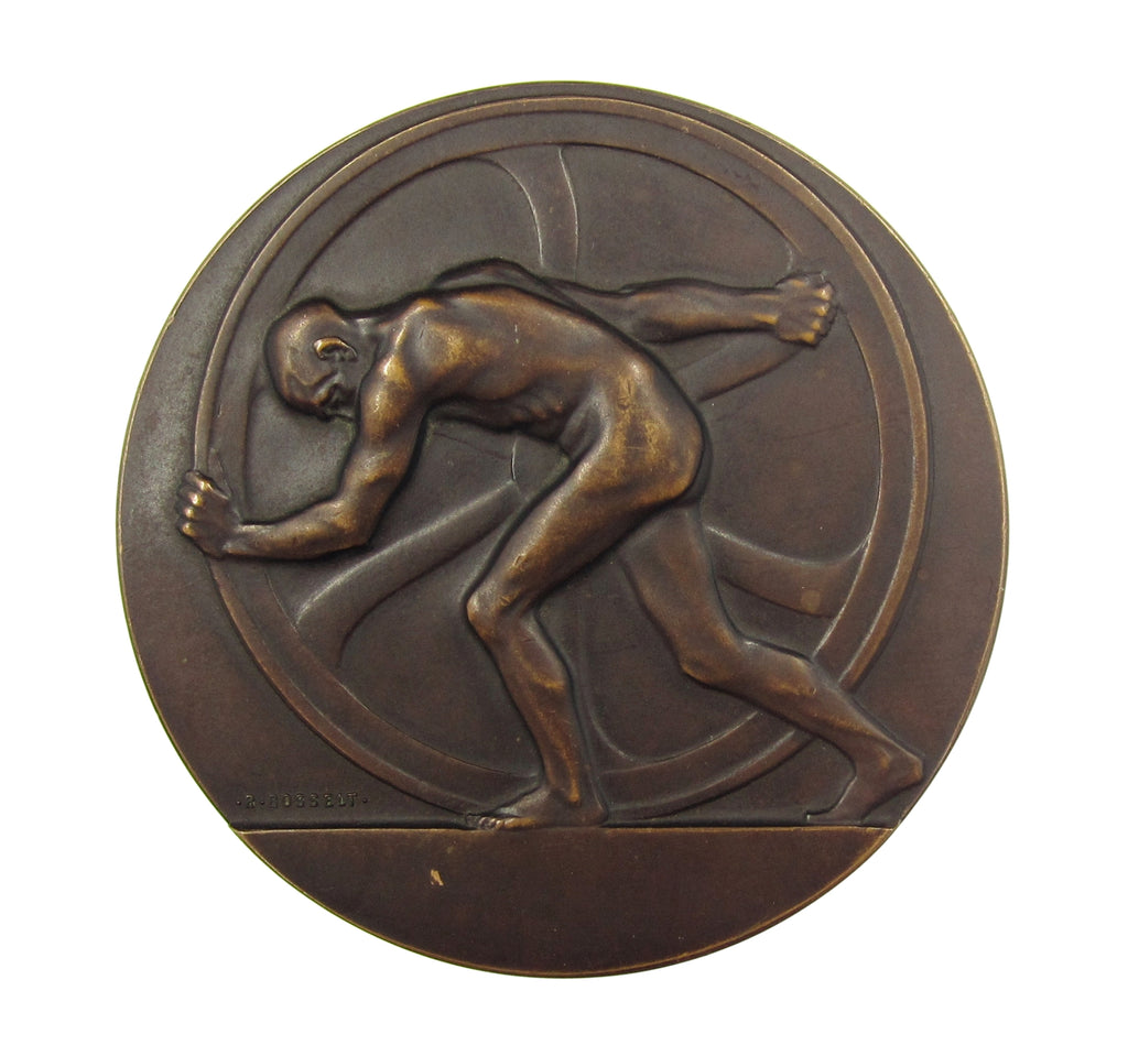 Obverse with naked man turning a large wheel to the left, reverse with legend within border. Edge stamped 'C. Pollath'.