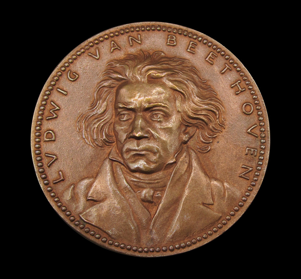 Obverse with full facing bust of famed composer with bushy hair and fierce expression. Reverse with flaming heart with crown and laurel. Edge plain.