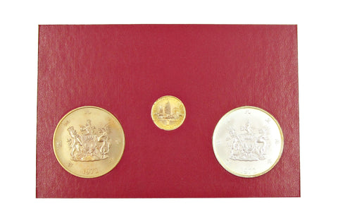 The set includes a 22ct gold medal of Sovereign weight, a 43mm silver medal and a 43mm bronze medal.