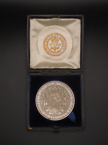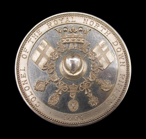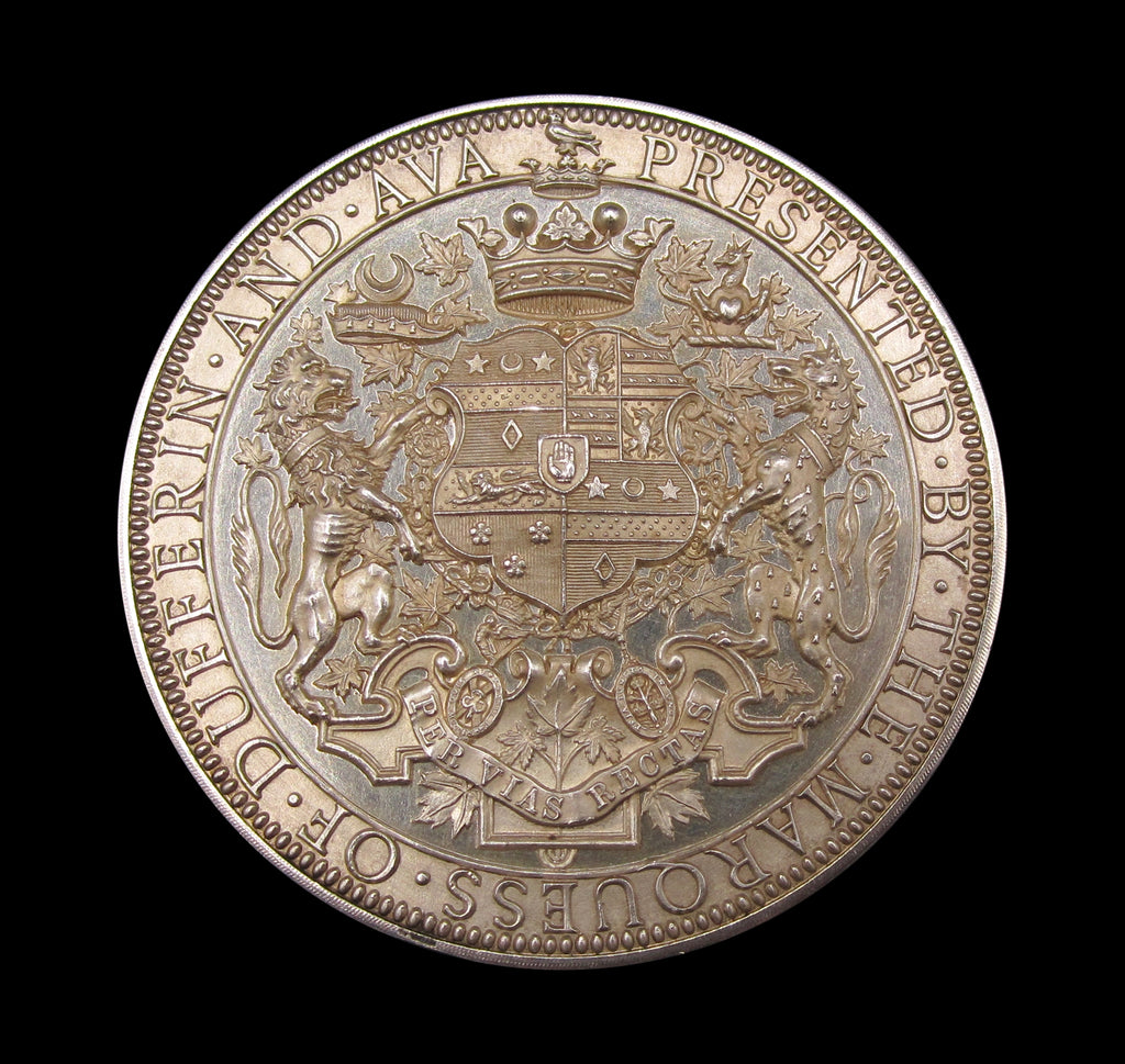 A silver award of Frederick Temple Hamilton-Temple, Marquess of Dufferin and Ava, Viceroy of India and Burma. Obverse with arms of Dufferin with supporters, reverse with the Lord’s orders of chivalry suspended from a chain, crown above and single flag either side of heart. Engraved around border with 'Colonel Of The Royal North Down Rifles - 1891'. Edge engraved 'James R. Mitchell. 3rd Batt. R.I.R. 1891'.