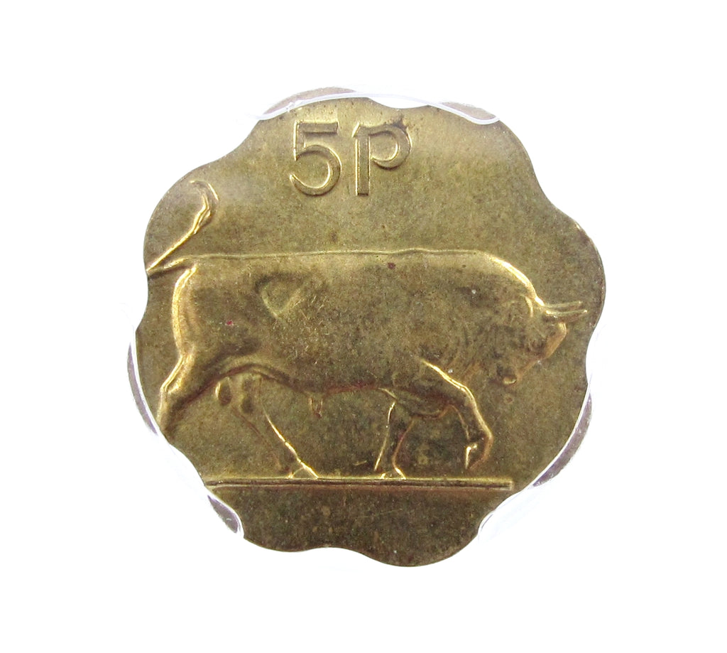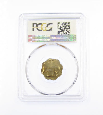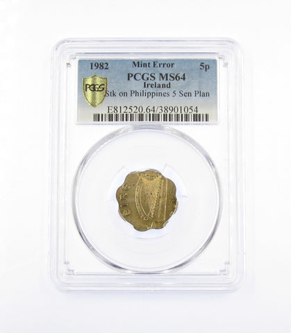 Erroneously struck on a scalloped blank intended for the Philippines 5 Sentimos issue (KM 225).