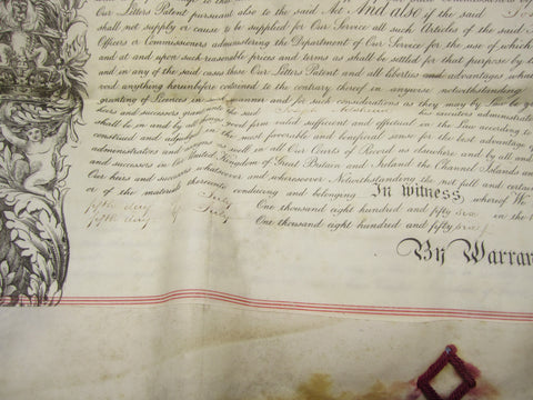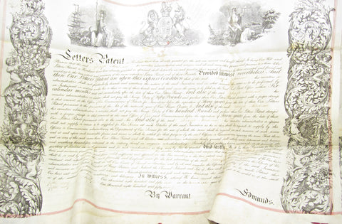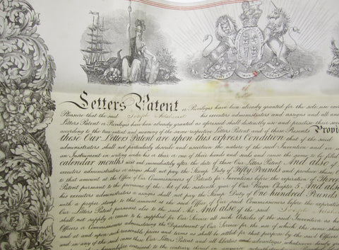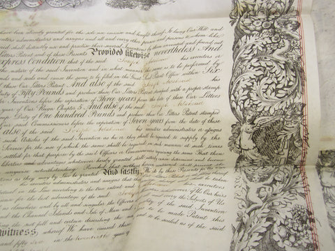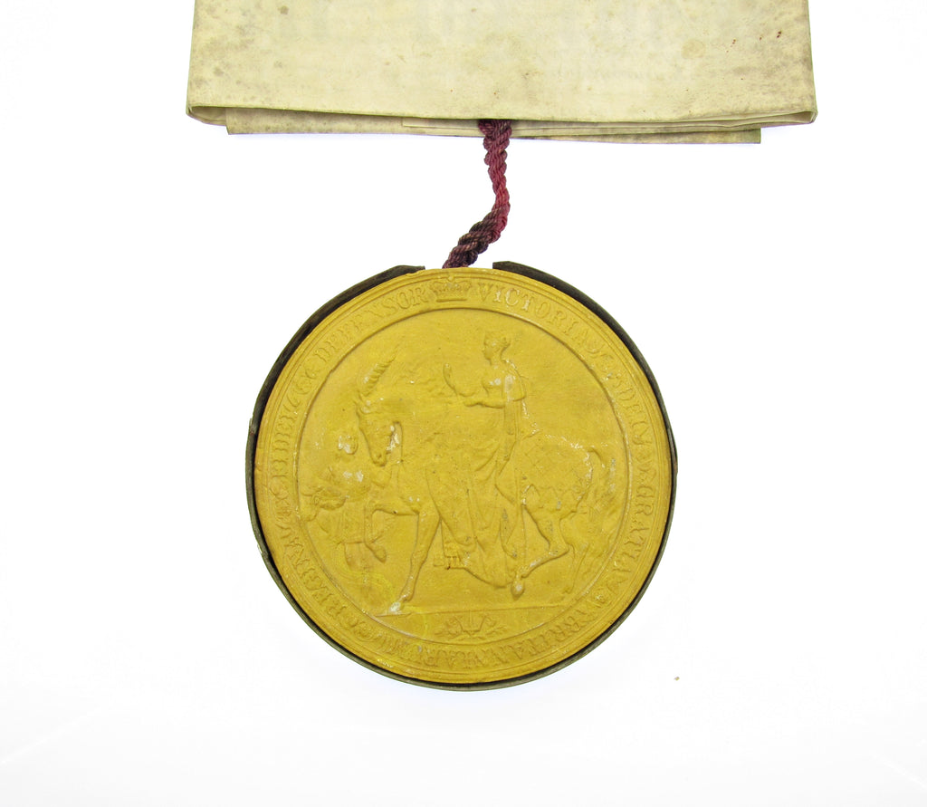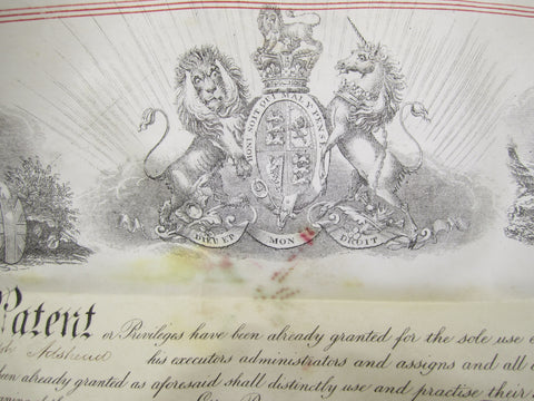 Attached to the seal is a vellum parchment referring to a patent named to Joseph Adshead for a material to be used as a substitute for plastering, painting, papering, white washing and colouring.