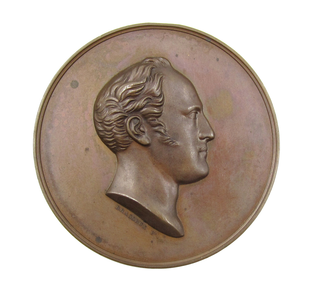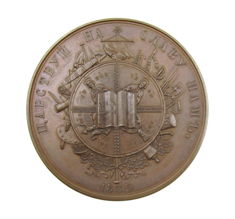 Obverse with bare head of Nicholas I, reverse with ornate medallion with Saints Nicholas, Andrew, and Vladimir (together with St. George on horseback) supporting an open book inscribed "Code of Laws" in Russian, symbols of the military and nautical arts surrounding.