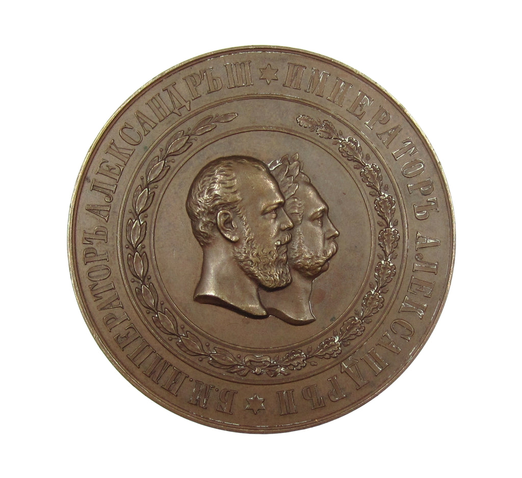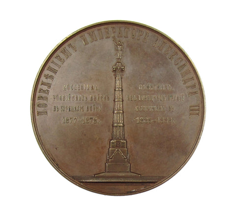 Obverse with conjoined busts of Alexander III and Alexander II right within wreath of oak and laurel, their names and titles around, reverse with view of the monument which was cast from captured Turkish cannons