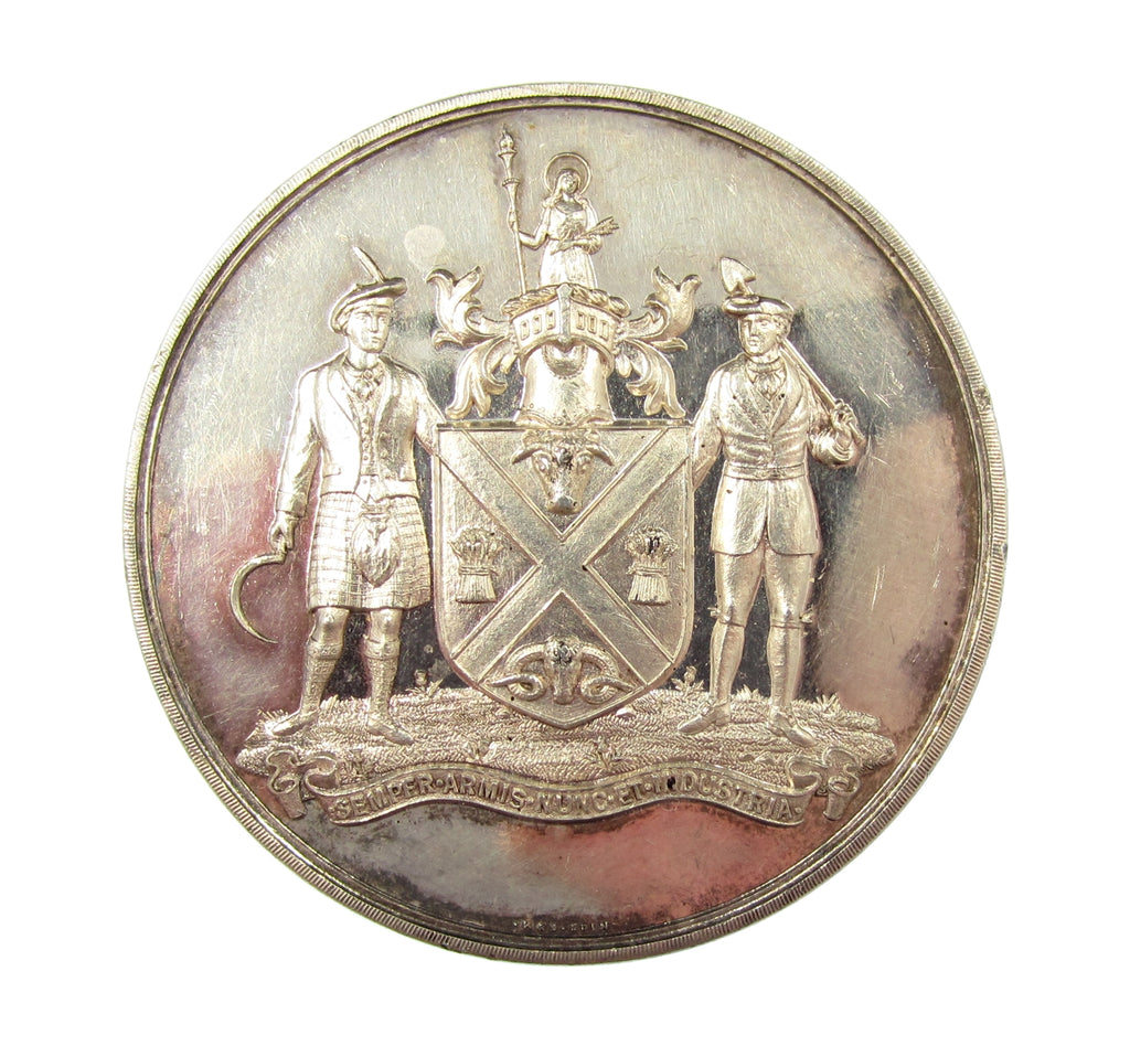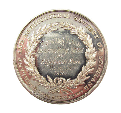 Obverse showing agricultural workers, reverse named within wreath to 'Messrs R&G Young - Arradohl Mains Buckle - For Clydesdale Mare - Huntly 1939'.