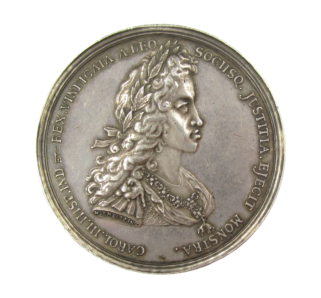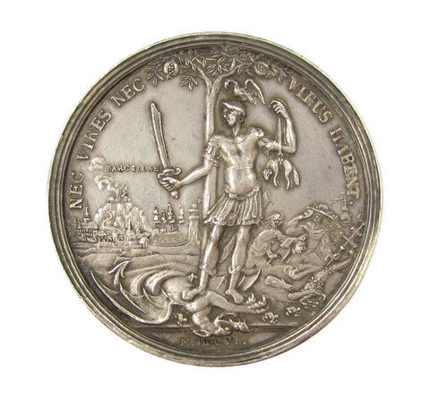 Obverse with armoured bust of Charles VI, Holy Roman Emperor, as Charles III of Spain. The reverse depicts Jason beneath a pomegranate tree holding up the Golden Fleece, a cardinal, executioner (holding head) and frogs flee the city, seen in cityscape beyond, with English fleet at sea. Edge plain.