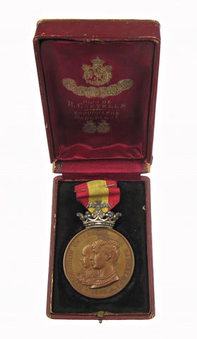 Conjoined busts of Alfonso XIII and the Queen Regent, reverse showing Fame and winged Cupid over a view of the Exposition pavilions.