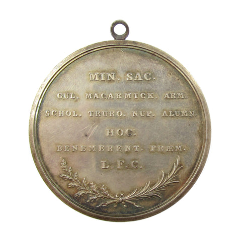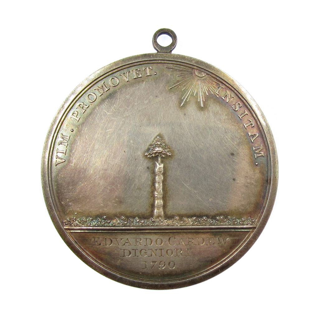 Truro School prize medal, reverse with legend in seven lines, obverse with a young sapling growing from a stump and named in exergue to 'Edvardo Cardew - Digniori - 1790'.