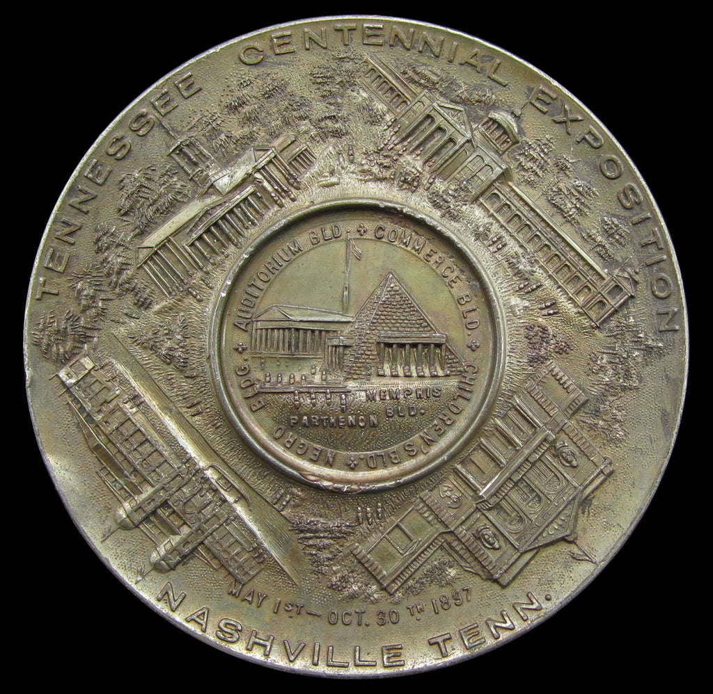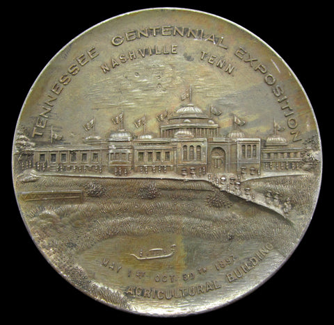 Tennessee Centennial Exposition souvenir medal marked May 1-Oct 30th 1897. Obverse with view of the Auditorium and Commerce Buildings, Children's and Negro Buildings, with the reverse showing the Agricultural Buildings.