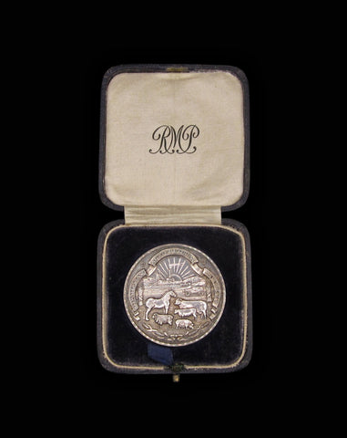 Obverse with group of farmyard animals, car and factory in background. Reverse named to Edwards Bros for 'Champion Single Ear Maize, White Potchefstroom Pearl - Sept 1930'.