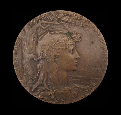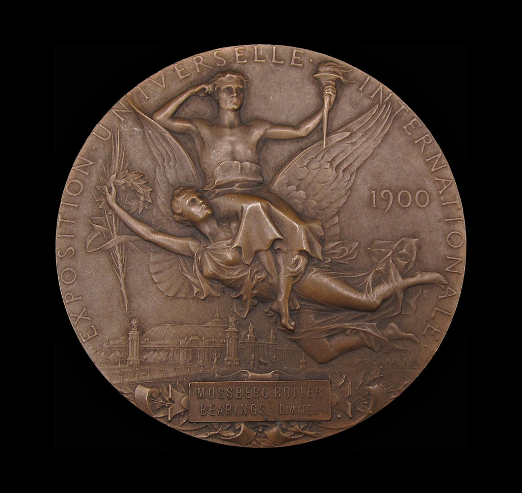 Obverse with capped head of Marianne, reverse with female figure of Victory carrying Industry, bearing a torch, the Exposition site below. Named in tablet to 'Mossberg Roller Bearings Limited'. Edge stamped bronze.
