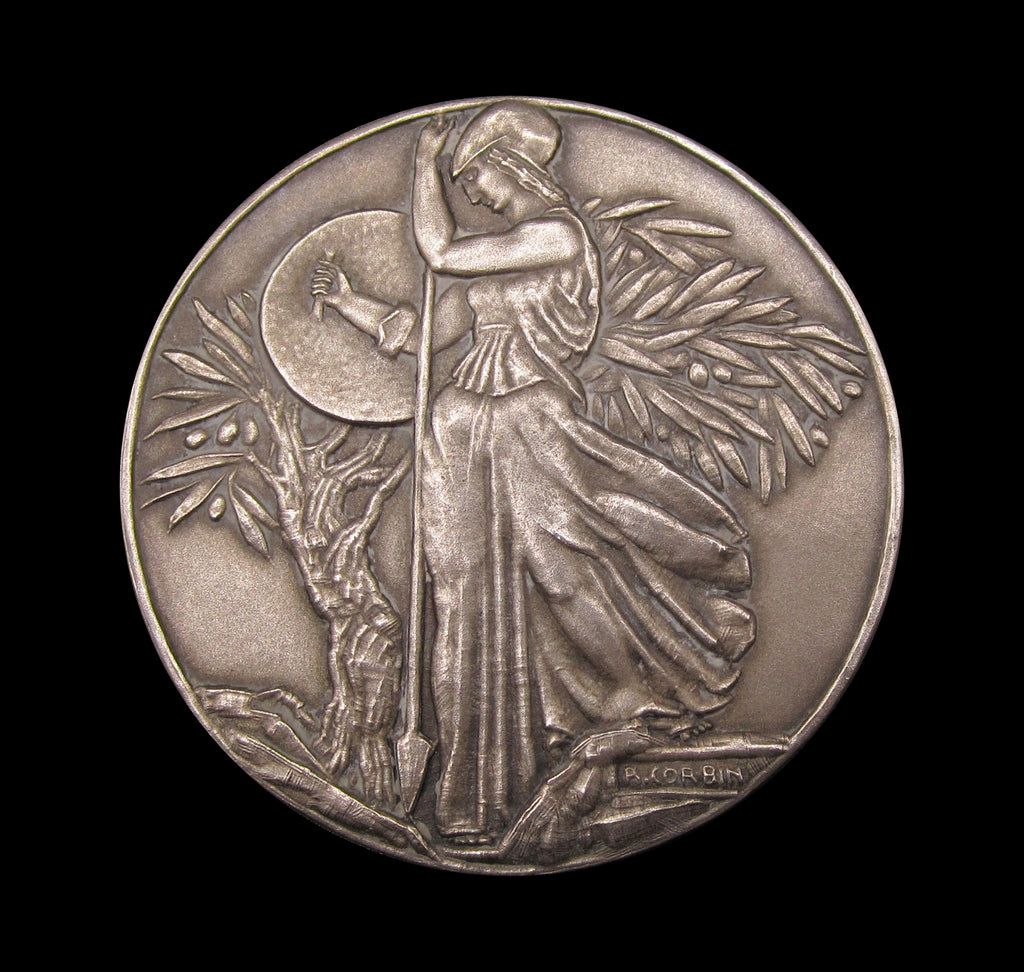 Obverse with Minerva standing with spear and shield before olive tree, reverse named to Miss D.B. Brownell - 1943 - Concours Special. Edge stamped argent.