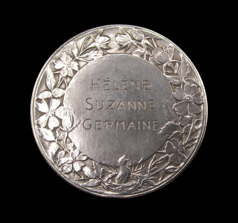 Obverse with mother holding and kissing child, reverse engraved within floral border 'Helene Suzanne Germaine'. Edge stamped argent.