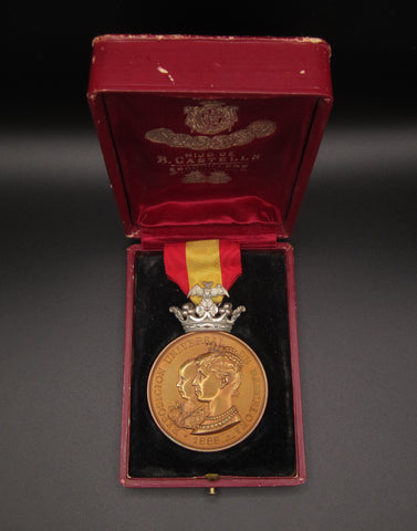 Conjoined busts of Alfonso XIII and the Queen Regent, reverse showing Fame and winged Cupid over a view of the Exposition pavilions.